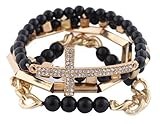 #10: Ladies Black with Gold 4 Piece Bundle of Iced Out Cross, Link, & Bar Chain Beaded Stretch Bracelet