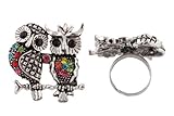 #8: 2 Pieces of Ladies Silver with Multicolored Iced Out Love Bird Owls on Branch Adjustable Finger Ring